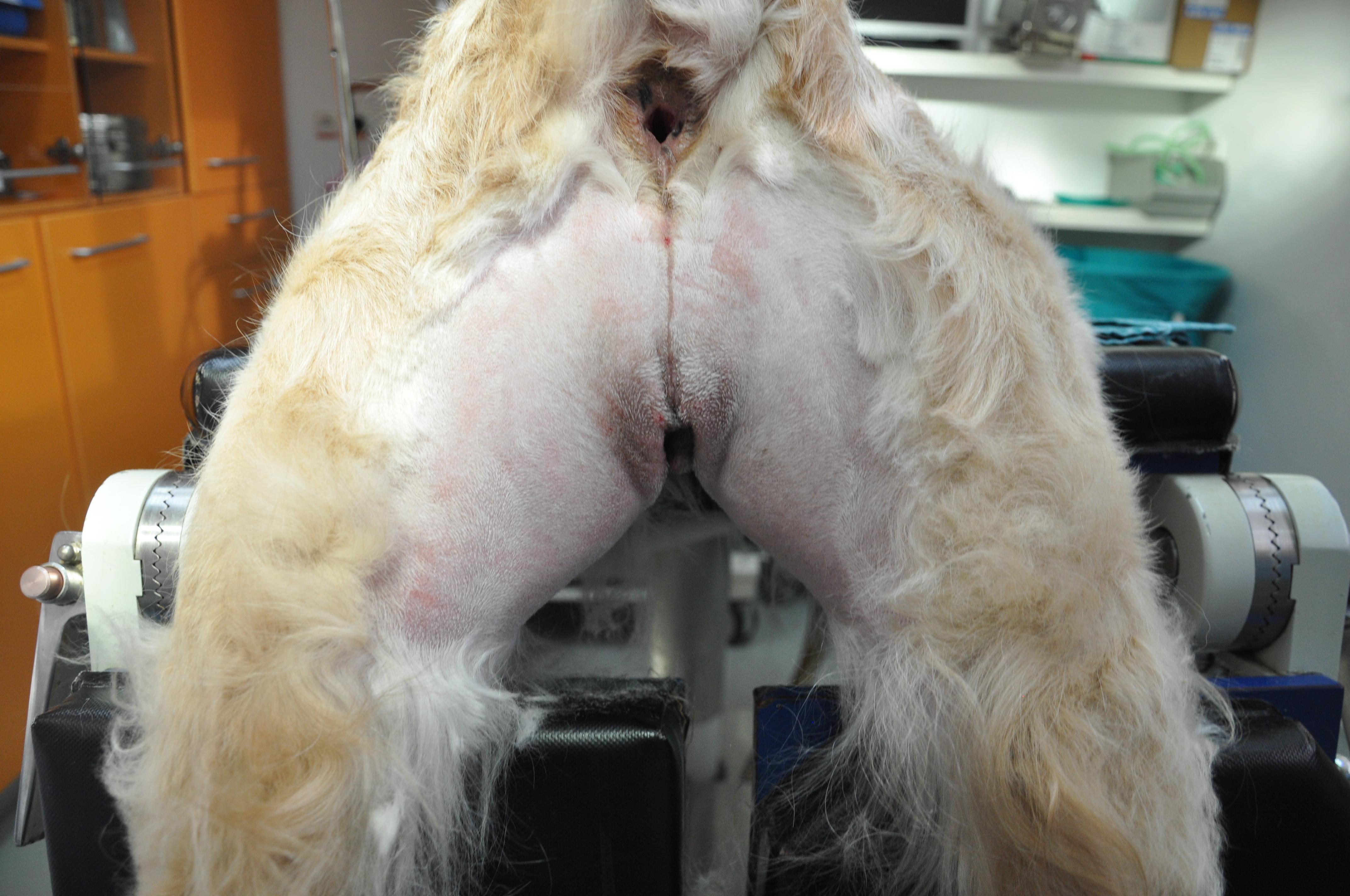 Na pregledu psička ne kaže odstopanj od normalnih vrednosti, malo je predebela, od pregledu zunanjega spolovila pa ugotovimo uvihanost sramnih ustnic, povešeno kožno gubo nad vhodom v nožnico ter vneto nožnično sluznico.