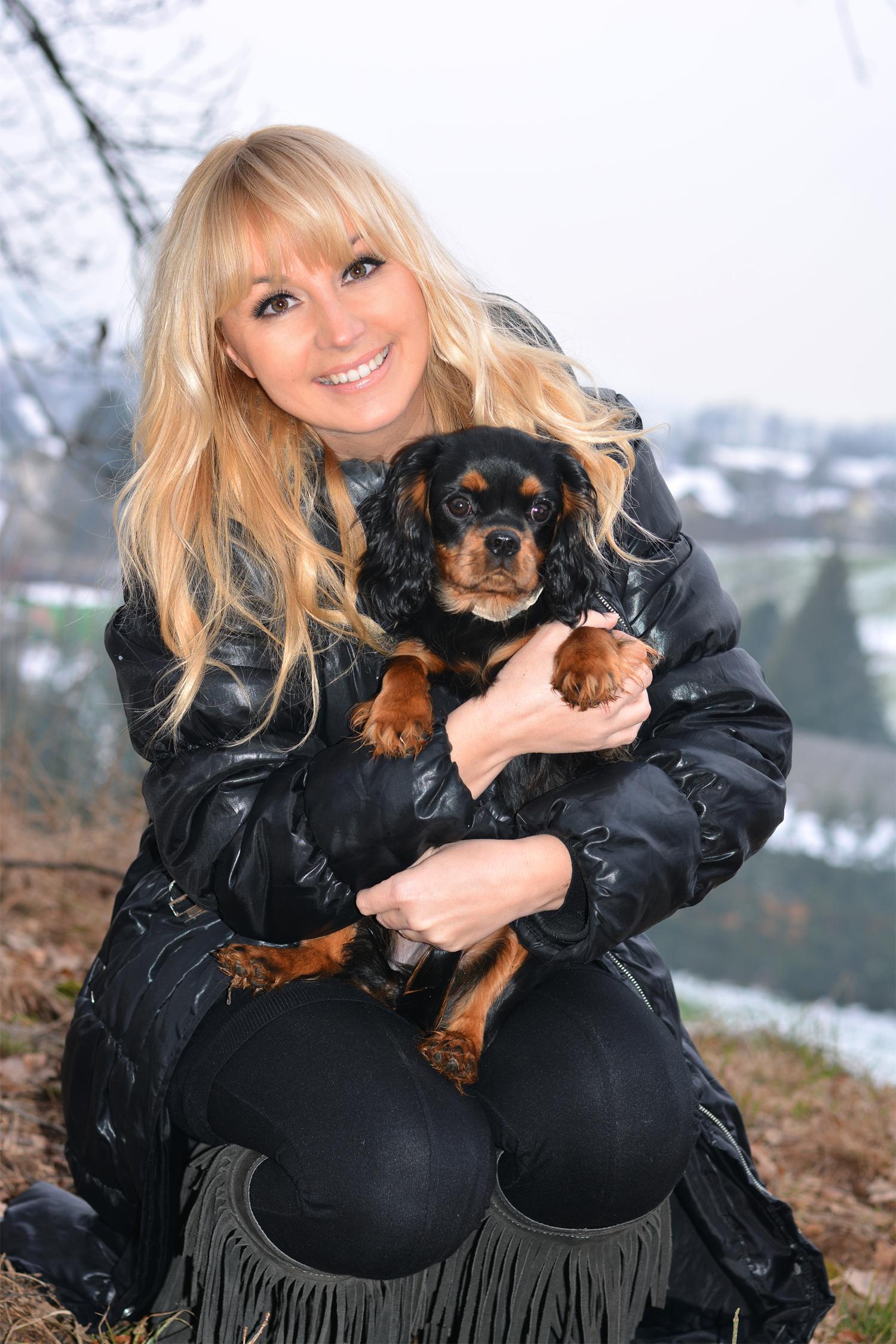 Ah, tam je pa druga zgodba. Doma je doma, tam ni treba biti tako fin (smeh)! Za zdaj ima dobrih pet kilogramov in čudovito paše v naročje (smeh). Najraje leži na Mihu, ker ima tam največ prostora. Ne moremo se zadržati, da je ne bi obsipali s poljubčki, jo ljubkovali, opazovali, občudovali in si vsak dan desetkrat povedali, kako je to kuža nad kužki! (smeh) Nadvse mi je všeč in je tudi zelo praktično, da se čudovito razume z vsemi štirimi mačkami, ki jih imamo in so čistokrvno uličnega porekla. Prav vse so bile zavržene, nekatere zapisane smrti … Sprejeli smo jih v dom in moram reči, da so ob sprejemu novega člana tudi one pokazale enako mero potrpljenja in gostoljubja. Res so bile do Candy zelo strpne že od prvega dne. Pa čeprav je to kdaj tudi izkoriščala (smeh). Za kavalirčke je značilno, da niso radi sami. Že družba mačke Azre je boljša od samote, a vseeno je ne puščamo same več kot uro. To nam uspeva tako, da jo velikokrat vzamemo s seboj po opravkih, sicer pa čez dan večino dela opraviva od doma. Zvečer, ko so nastopi, intervjuji ali snemanja, pa vse prepustiva mojim staršem, ki stanujejo nadstropje nižje. Tam je potem resna gneča, a se prav lepo »poštimajo« …