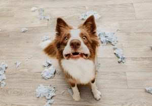 4. Žvečenje, grizenje in uničevanje predmetov v stanovanju je oblika zabave, s katero pes poskuša pregnati strah, dolgočasje in občutek osamljenosti v času, ko je sam. Takšno vedenje je nesprejemljivo, pa tudi nevarno, saj lahko pride do samopoškodbe psa, zloma zob, poškodbe tac in krempljev. Kadar v prisotnosti lastnika pes tega ne počne, lahko dejavnost nesporno povežete z ločitveno tesnobo.
