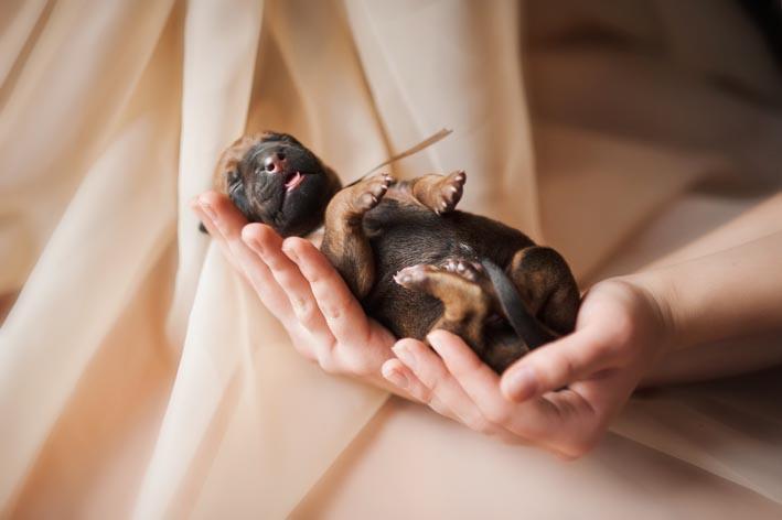 Mladička je v prvih dnevih in tednih zelo težko natančno pogledati, zato ker je drobcen, ranljiv in potrebuje toploto matere in sorojencev. Če se že lotite pregledovanja, se dotikajte psička vedno s toplo brisačo, raje kot z golo roko in ga nikakor ne odtujite od mame za več kot nekaj minut. Bodite zelo potrpežljivi in se v prvih štirih tednih po kotitvi raje izogibajte pretiranemu dotikanju mladičkov, saj lahko vsako odtujevanje mladička od matere zanj predstavlja močan stres. Travme novorojenih pasjih mladičkov pa lahko pustijo trajne posledice na vedenju psa skozi vse življenje. Ko se torej lotite pregledovanja mladička, to opravite skrbno in nežno, a kar se da hitro.
