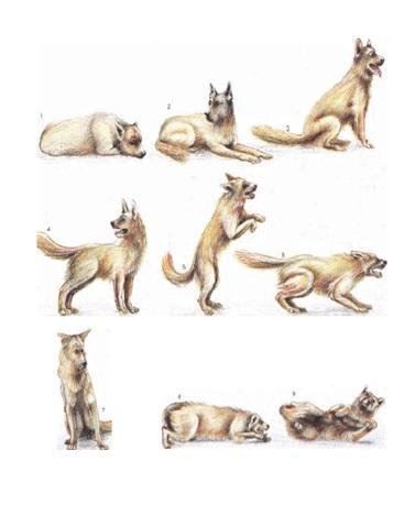 Opis: 1 – Pes spi., 2 – Zanimanje in čuječnost., 3 – Pes je pozoren., 4 – Prijazno zanimanje., 5 – Velika prijaznost in veselje., 6 – Grožnja in agresivnost., 7 – Zadržan do plašen., 8 – Boječ in podvržen., 9 – Predaja ali vodilo k igri.
