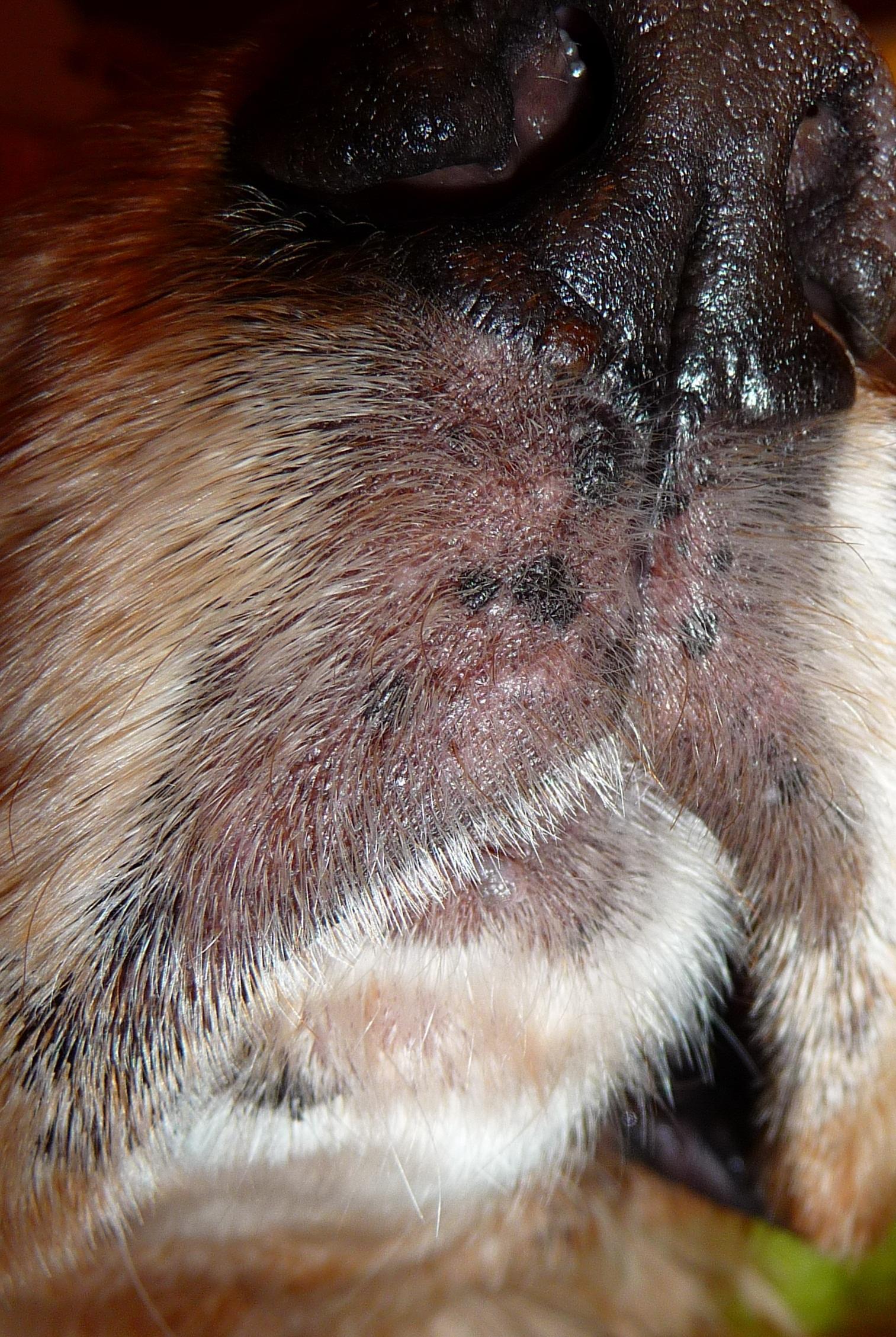 Razvoj glivične okužbe je izredno počasen, zato ga marsikateri lastnik opazi šele, ko pes postaja vedno bolj nemiren, se vedno bolj praska, vozi po zadnji plati, začne šepati zaradi vnetih tac ali postane neješč, ker se okužba razširi na gobec in povzroča pekoč občutek, kadar pes poskuša jesti. Žal pa ni samo razraščanje glivične okužbe počasno, vendar je tudi zdravljenje zelo zahtevno in dolgotrajno.