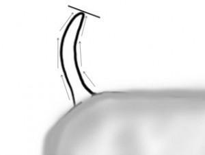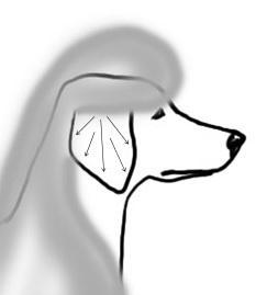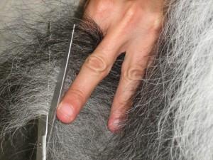 Kadar se odločimo za daljšo dlako na ušesih, dlako počešemo naravnost navzdol, primemo med kazalec in sredincem, potegnemo stran od ušesa ter skrajšamo z ukrivljenimi škarjami ovalno na želeno dolžino. Po končanem striženju ušesa spustimo v naravni položaj in v tem položaju odpravimo nepravilnosti v striženju z efilirkami.