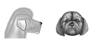 V večini primerov se dlaka na glavi striže s škarjami. Če se odločimo za striženje s strojčkom, naj se osnovni poteg začne na sprednji strani, na sredini glave in poteka nazaj do vihra. Pri tem pazimo, da z nastavkom ne zajamemo ušesa in kotičke oči. Nadaljujemo s krajšanjem dlake na bradi in licih. Dlako na bradi strižemo od sprednjega dela čeljusti nazaj proti vratu. Nadaljujemo z licema, kjer poteg poteka od vrha bočnega predela glave navzdol proti vratu in nato na zgornji čeljusti od spredaj nazaj. Tako postriženo dlako na glavi nato obdelamo z manjšimi efilirkami. Zaradi velikega števila prehodov na predelu glave in manjših kotičkov okoli ušes in na čeljusti bo striženje samo s strojčkom skoraj nemogoče. V večini primerov uporabimo za striženje dlake na glavi s strojčkom vsaj nekaj milimetrov večje nastavke kot na telesu. Dolžina naj ne bo krajša od 7 milimetrov.