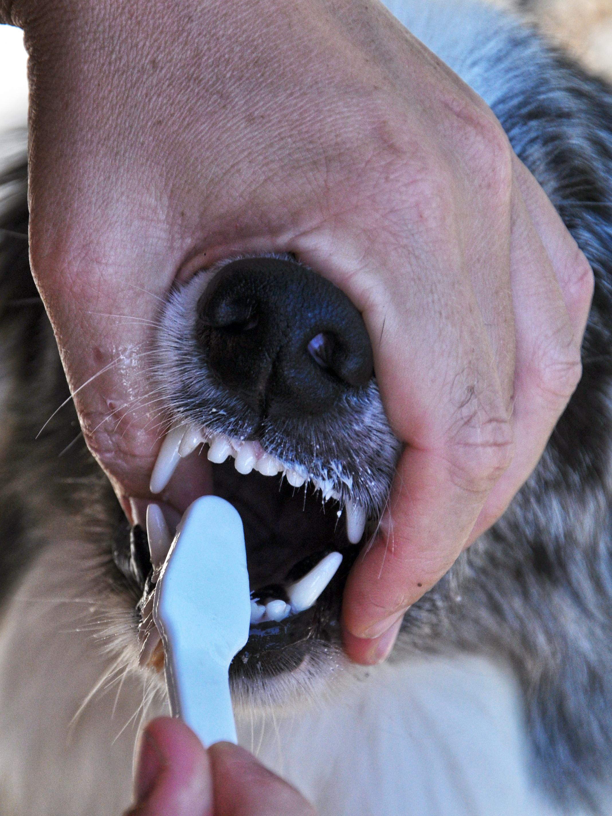 Najprej nam mora pes dovoliti, da mu odpremo gobec, dvignemo ustnice in pogledamo zobe. Nato mu pokažemo ščetko in pasto, da vse prevoha in poskusi njen okus. Za začetek poščetkamo samo en zob, najbolje čekan, ki je velik in dostopen ter ga lahko brez težav dosežemo. Enkrat potegnemo s ščetko po zobu in psa takoj nagradimo s priboljškom. Postopoma naredimo vedno več potegov in dodajamo vedno več zob. Najprej z zunanje strani, nato pa še z notranje. Psa za potrpljenje vedno prisrčno pohvalimo in nagradimo. Če bomo redno vadili, bomo v dveh tednih lahko temeljito poščetkali vse zobe v pasjem gobcu. Psu ne smemo dovoliti, da ščetko grize. Lahko pa mu na koncu, za nagrado, pustimo, da z nje poliže preostanek zobne paste. Tako bo tudi vedel, da je takrat opravila konec in da je prost.