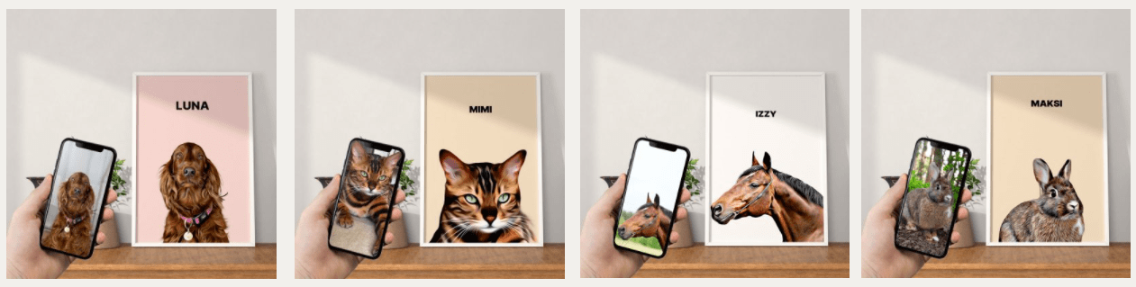 V naslednjem koraku izberete velikost portreta, barvo ozadja in okvir, če ga želite. Vpišete tudi ime živali, ki bo prikazana na portretu. Fotografija vašega kosmatinca je zdaj prepuščena rokam izkušenih mojstrov, ki jo bodo spremenili v svojo najbolj izjemno in unikatno verzijo.