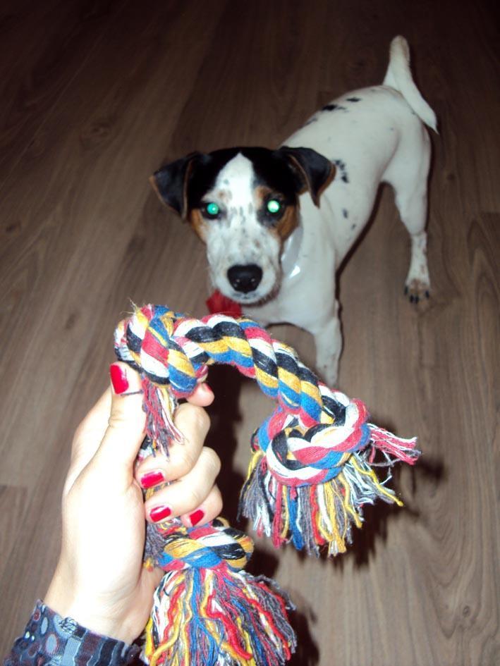 ‒ Ko pride pes do nas, mu žogo vzamemo ali uporabimo predhodno naučeno povelje »izpusti«. Iz žoge iztisnemo priboljške ter ga z njimi nagradimo. Pes se bo naučil, da bo okusno nagrado dobil le, če nam bo žogo prinesel.