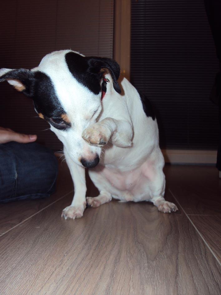 ‒ Ko bo dvignil tačko, da bi si odstranil nalepko, uporabimo ukaz, na primer »sram«, ki ga pozneje, ko bo pes trik že obvladal, po želji uporabljamo v stavku ali besedni zvezi.