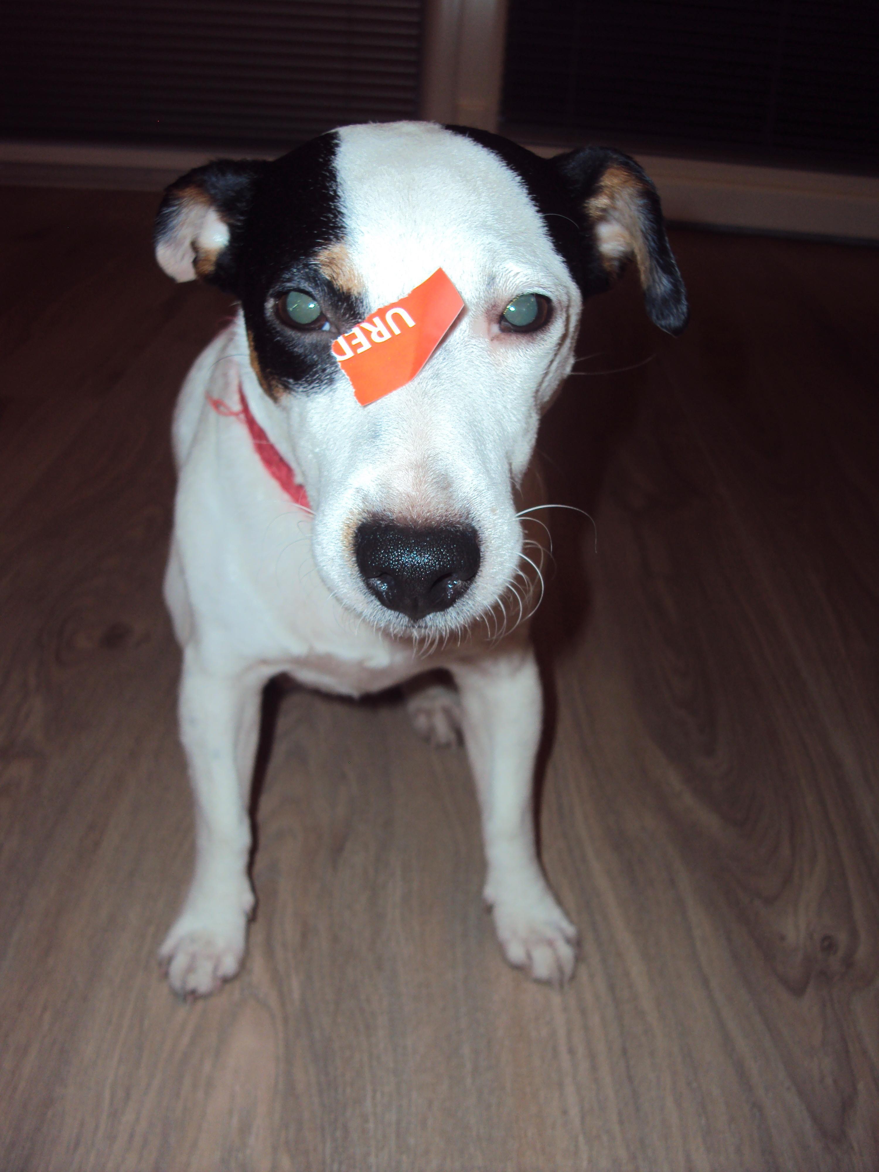 ‒ Psu med oči in smrček namestimo lepilni trak ali nalepko, ki si jo bo nagonsko takoj želel odstraniti.