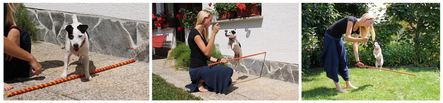 • Ko pes začne palico preskakovati, začnemo uporabljati ukaz. Če se s psom udeležujemo tečaja agilityja, lahko uporabimo isti ukaz kot za preskok višinske ovire. Izberemo lahko na primer »hop«, »jump«. Dobro izvedbo nagrajujemo in psa pohvalimo.