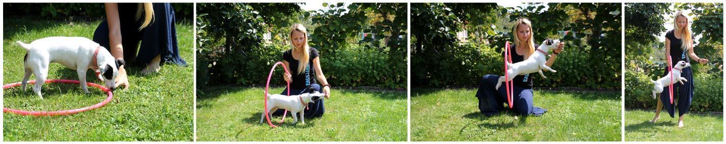 • Naslednja faza je dviganje obroča s tal. Najprej vadimo z nizkimi skoki, nato pa višino postopoma povečujemo. Paziti moramo, da je primerljiva zmogljivostim našega psa in njegovi višini. Pri spodbujanju skoka skozi obroč si lahko pomagamo tudi z nebesednimi znaki, na primer s kazanjem z roko skozi obroč.