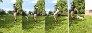 • Z višanjem pozicije noge kot tudi višanjem višine igrače bo pes primoran skočiti na našo nogo in se od nje odriniti proti igrači.