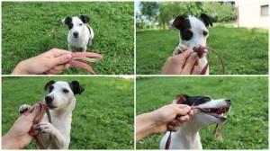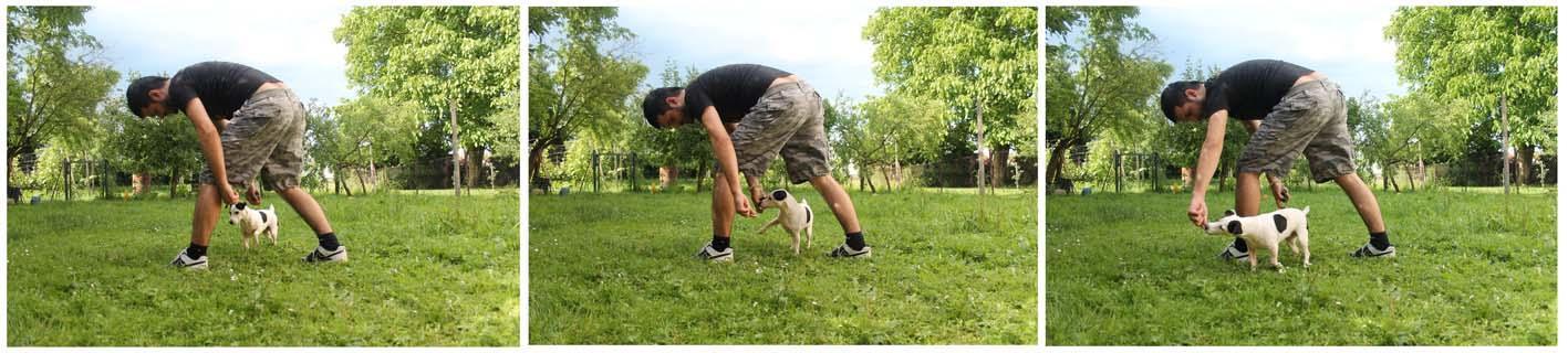 • Pes bo kmalu dojel, da mu takšno gibanje prinese slasten priboljšek, zato bo sam ponudil želeno vedenje. Na tej stopnji dodamo še besedni ukaz »vzemi« ter nadaljujemo s ponavljanjem vaje še z besedo.
