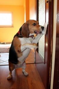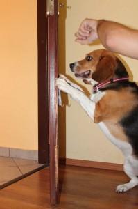 • Ko začne s taco potiskati predmet, lahko vrata malo pripremo. Spet mu s prstom pokažimo na predmet in kliknemo, ko se nasloni na vrata ter jih zapre. Z malimi kužki lahko takšen trik vadimo na vratih nočne omarice ali na vratih pralnega stroja.