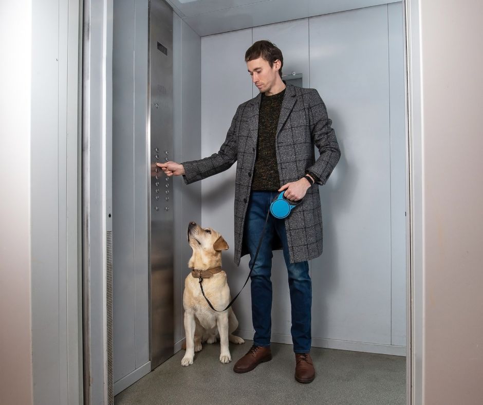 • Za varen vstop in izstop dvigala vedno opazujte psa pri vstopanju. Naj ne vstopa preveč pred ali preveč za vami, tako, da bi se lahko zgodilo, da bi ostal sam na kateri koli strani dvigala.
