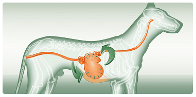 Razširitev (dilatacija) in zasuk (torzija) želodca sta smrtno nevarni bolezenski stanji, ki potrebujeta hitro ukrepanje. Pri razširitvi (dilataciji) se želodec napolni z zrakom in pritiska na ostale organe v trebušni votlini, s tem tudi na trebušno prepono, kar psu otežuje dihanje. Napihnjen želodec stisne žile v trebuhu, kar preprečuje vračanje krvi v srce. Želodec napolnjen z zrakom se lahko tudi zasuče okoli svoje kratke osi, to bolezensko stanje imenujemo zasuk (torzija) želodca. Prekine se dotok krvi in želodec začne odmirat, porušena je celotna preskrba s krvjo, prekinjen je proces pretakanja hranil po krvi do telesnih tkiv, pomanjkanje pa lahko vodi do celičnih poškodb in celo smrt organov.