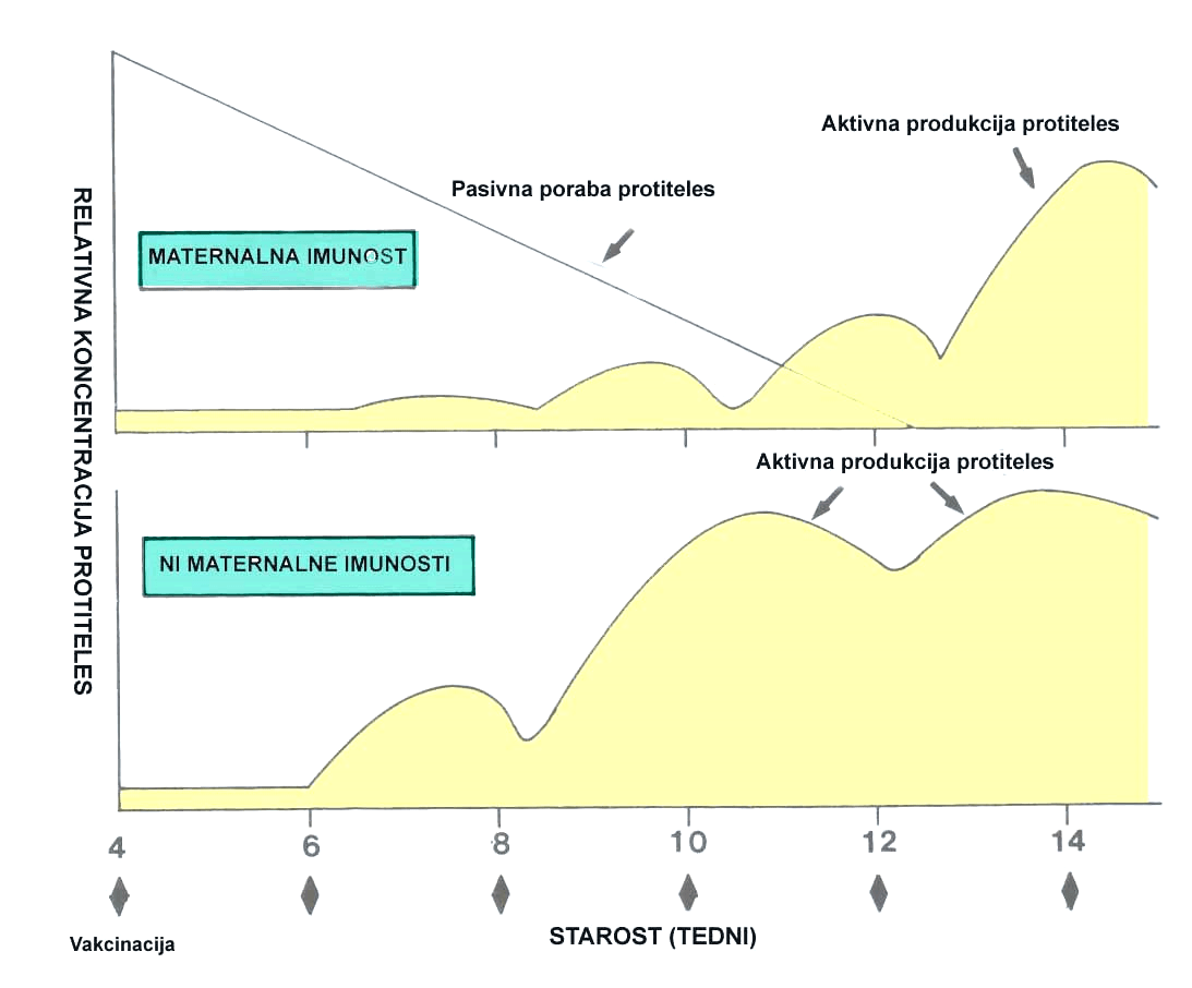 Shema prikazuje vpliv mleka cepljene psice na proizvodnjo specifičnih protiteles v mladičku. Iz te je razvidno, da je treba mladiča necepljene matere prvič cepiti okoli 6. tedna, mladiča cepljene matere pa nekoliko pozneje, okoli 8. tedna starosti.